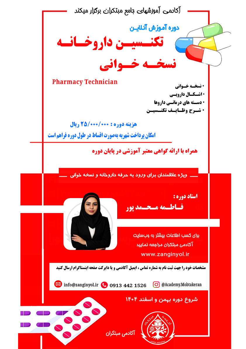 اگر به ورود به دنیای داروخانه و نسخهخوانی فکر میکنید، این دوره نقطه شروع شماست. آکادمی آموزشی جامع مبتکران برگزار میکند: دوره آنلاین تکنسین داروخانه (نسخهخوانی) با آموزشهای کاربردی، سرفصلهای استاندارد و ارائه گواهی معتبر پایان دوره.